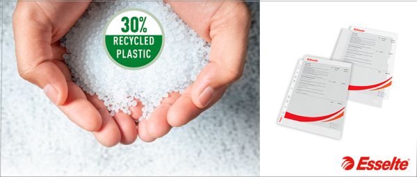• A LEITZ és ESSELTE lefűzhető tasakok széles választéka 30%-ban fogyasztás előtti újrahasznosított alapanyag felhasználásával készül, és továbbra is 100%-ban újrahasznosítható a szokásos műanyag újrahasznosítási eljárásokban