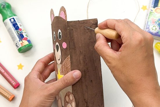 5. Ahhoz, hogy a lámpást rögzíteni tudjuk, egy éles tárgy segítségével óvatosan lyukakat kell szúrnunk a doboz jobb és bal oldalára. Fűzzük át rajta a madzagot, és csomózzuk meg erősen, hogy ki ne csússzon belőle. Ezután helyezzük a LED fényfűzért a maciba, így már el is készült a hihetetlenül aranyos, egyedi lámpásunk.