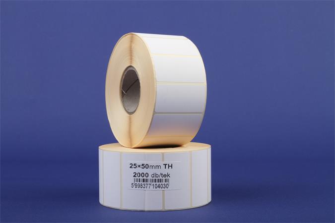 A thermo címkék használata gazdaságos, mert nyomtatáskor nincs szükség festékszalagra, a felirat ugyanis hő hatására kerül fel a címkére -mérete 25x50 mm (futásirány x szélesség) -kivitel: nyomatlan -anyag: thermo öntapadó papír -kiszerelés: 2000 címke/ tekercs -tekercs belső átmérő: 40mm