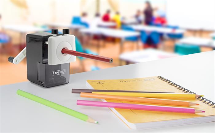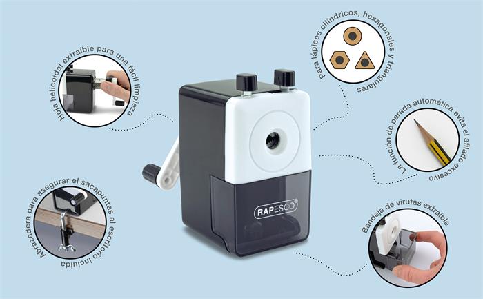 A Rapesco 64 asztali ceruzahegyezője stílusos, rendkívül funkcionális hegyező, amely számos funkcióval rendelkezik