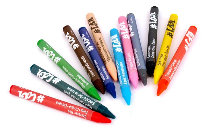 -a készletben összesen 12 db zsírkréta található: citromsárga, narancssárga, piros, világos rózsaszín, pink, égkék, sötétkék, világoszöld, sötétzöld, barna, szürke, fekete színekben
