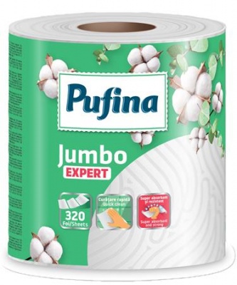 Háztartási papírtörlő, 2 rétegű, 320 lap, 1 tekercses, PUFINA "Expert", hófehér
