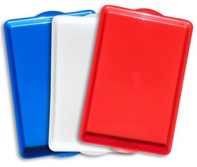 Négyszög formájú műanyag tálca.